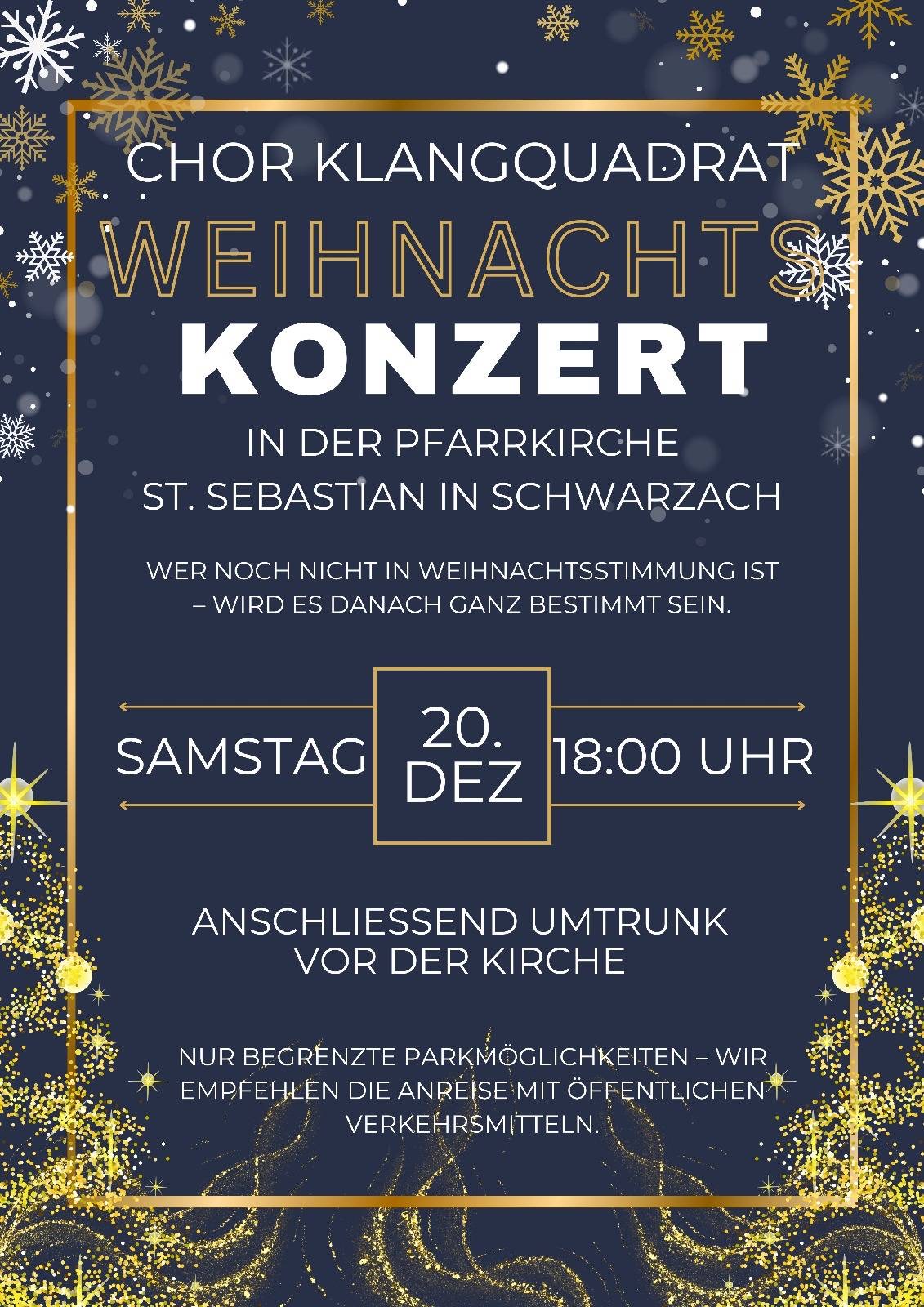 dieses Jahr lädt der Wolfurter Chor Klangquadrat unter der Leitung von Werner Geiger alle Interessierten herzlich zum Weihnachtskonzert am Samstag, 20. Dezember 2025, um 18.00 Uhr in die Pfarrkirche Schwarzach mit anschließendem stimmungsvollem Umtrunk ein.