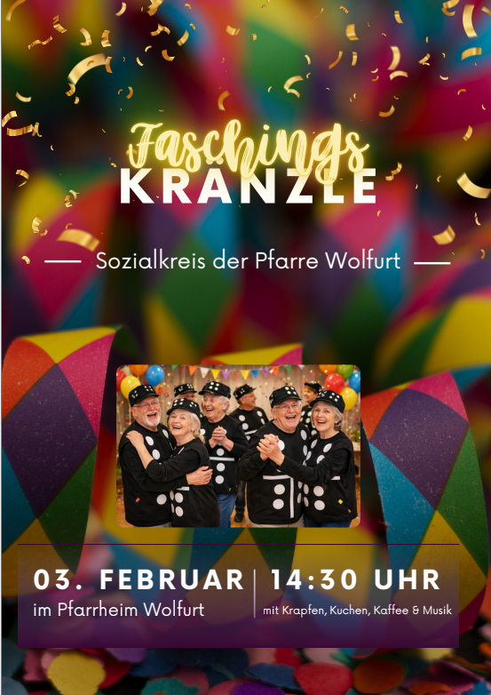 Wir laden euch herzlich zu unserem Faschingskränzle ein. Dieses Jahr verkleiden wir uns als Dominosteine und unter dem Motto: „Fasching verbindet – wie beim Domino“, wollen wir gemeinsam einen bunten Nachmittag bei Krapfen, Kuchen und Kaffee, mit Musik und Tanz und mit Lachen und Fröhlichkeit verbringen.