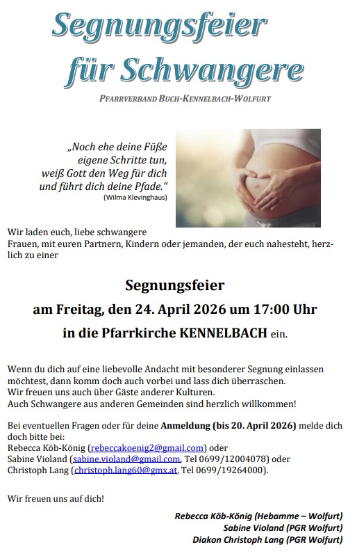 Wenn du dich auf eine liebevolle Andacht mit besonderer Segnung einlassen möchtest, dann komm doch auch vorbei und lass dich überraschen. Wir freuen uns auch über Gäste anderer Kulturen. Auch Schwangere aus anderen Gemeinden sind herzlich willkommen! Bei eventuellen Fragen oder für deine Anmeldung (bis 20. April 2026) melde dich doch bitte bei: Rebecca Köb-König (rebeccakoenig2@gmail.com) oder Sabine Violand (sabine.violand@gmail.com, Tel 0699/12004078) oder Christoph Lang (christoph.lang60@gmx.at, Tel 0699/19264000).